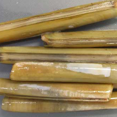 細長く、全体に薄い茶色をしている貝、干潟や浅い泥の海に深く潜って棲息している。